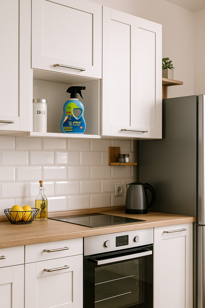 Kitchen Cleaner: Spray → Wait 30 sec → Wipe with a damp cloth.